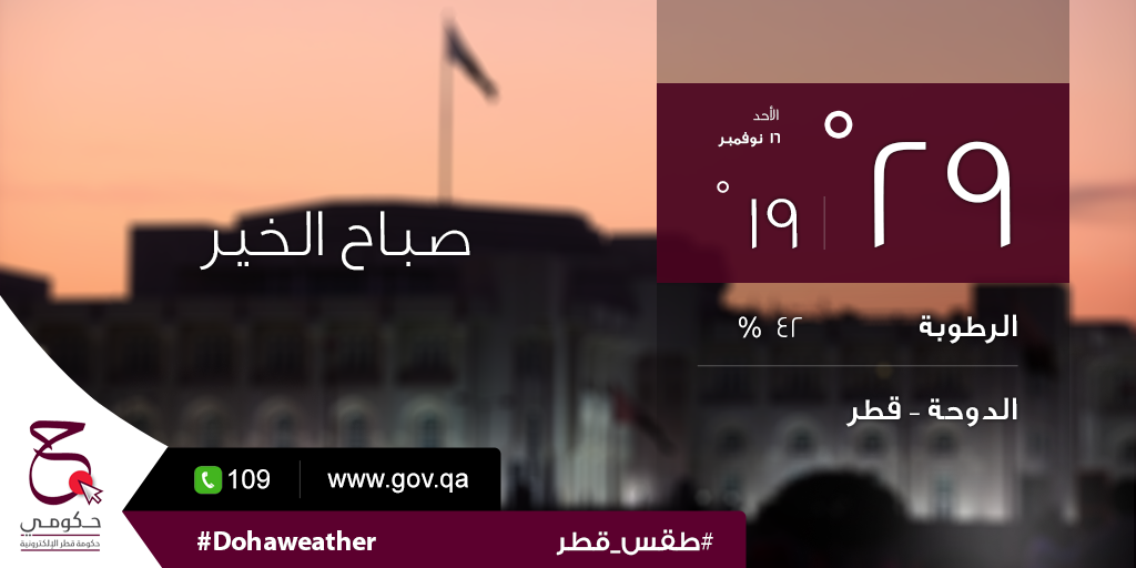 درجة الحرارة اليوم الكبرى ٢٩ و الصغرى ١٩ و نسبة الرطوبة ٤٢ % #حكومي #طقس_قطر #الدوحةpic.twitter.com/kQQ5RioslW