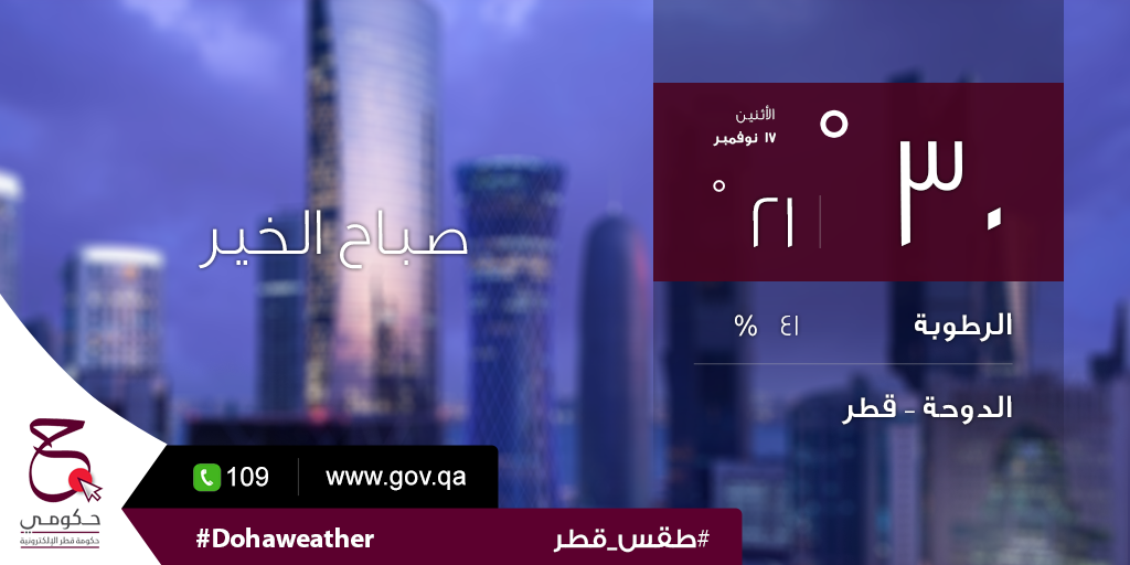 درجة الحرارة اليوم الكبرى ٣٠ و الصغرى ٢١ و نسبة الرطوبة ٤١ % #حكومي #طقس_قطر #الدوحةpic.twitter.com/fCDTa2uaM1