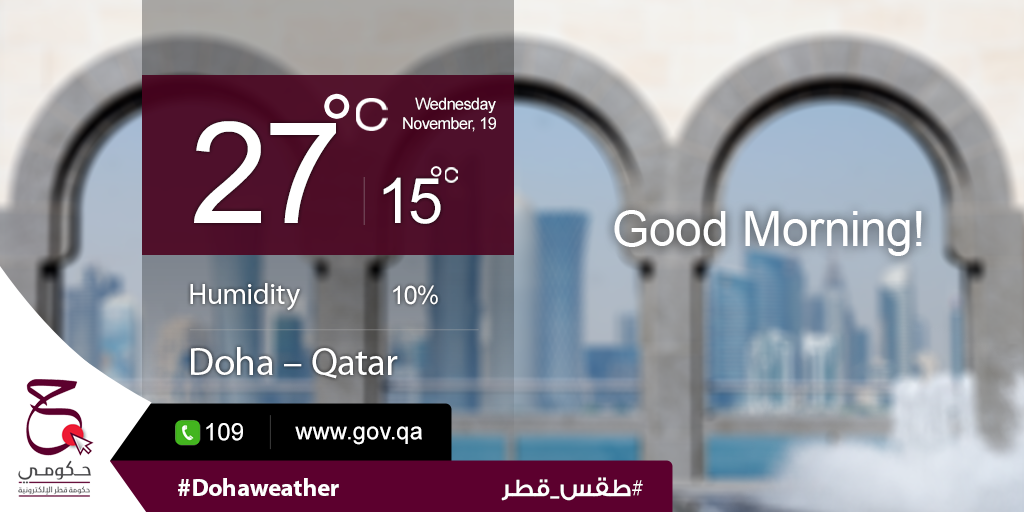 Today's highest temp: 27ºC, lowest temp: 15ºC and humidity: 10%. #Hukoomi #Qatar #DohaWeatherpic.twitter.com/ySFi8AKKPv