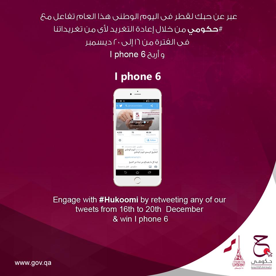 تفاعل مع #حكومي على تويتر من خلال إعادة التغريد بين 16-20 ديسمبر و أربح "آي فون 6". http://bit.ly/1Grd59I #قطر"pic.twitter.com/8fuYAziYeD