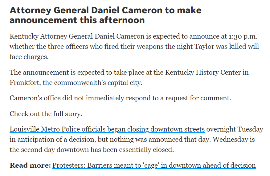 #BREAKING: Breonna Taylor grand jury decision is expected to be announced by the Kentucky AG at 1:30pm.