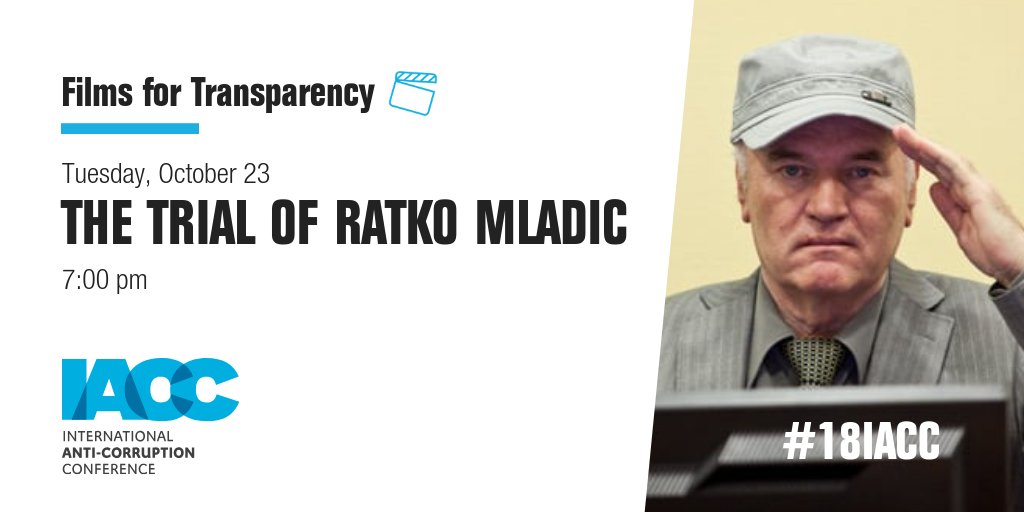 Filmed over 5 years, "The Trial of Ratko Mladic" tells an epic story of justice, accountability and a country trying to escape from its bloody past. Don't miss it today at 19:00 in Auditorium 15. #Films4Transparency #18IACC >> https://sched.co/GdP0 pic.twitter.com/8wg044TlWn