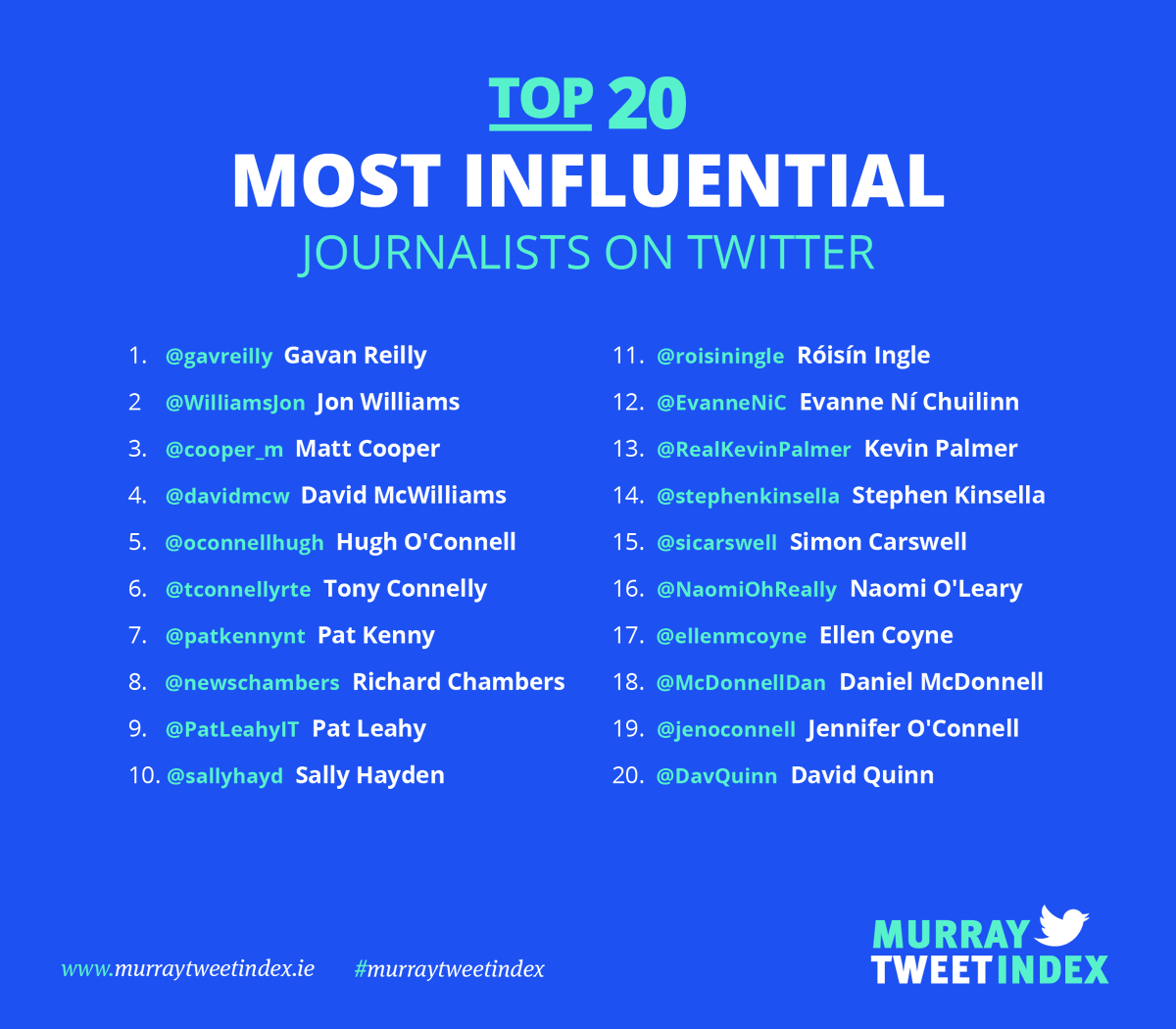 and my Irish Times colleagues. @IrishTimes had the largest number of journalists in the #MurrayTweetIndex top 100, with RTÉ in second place at 17. Independent News and Media had 14 https://www.irishtimes.com/business/technology/virgin-media-s-gavan-reilly-named-most-influential-irish-journalist-on-twitter-1.4265021#.XtDOdMnEF_c.twitter … pic.twitter.com/C05AbadpQr