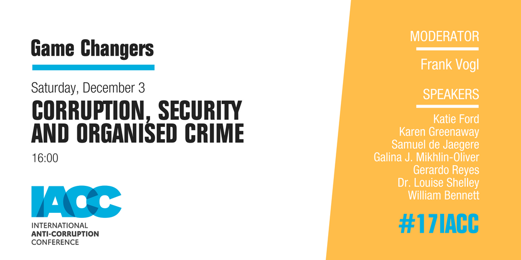 Corruption, security and organised crime w/ @frankvogl @GerardoReyesC, W.Bennett from @Saferworld & J. Vittori from @Global_Witness #17IACCpic.twitter.com/C85ktpBAGh