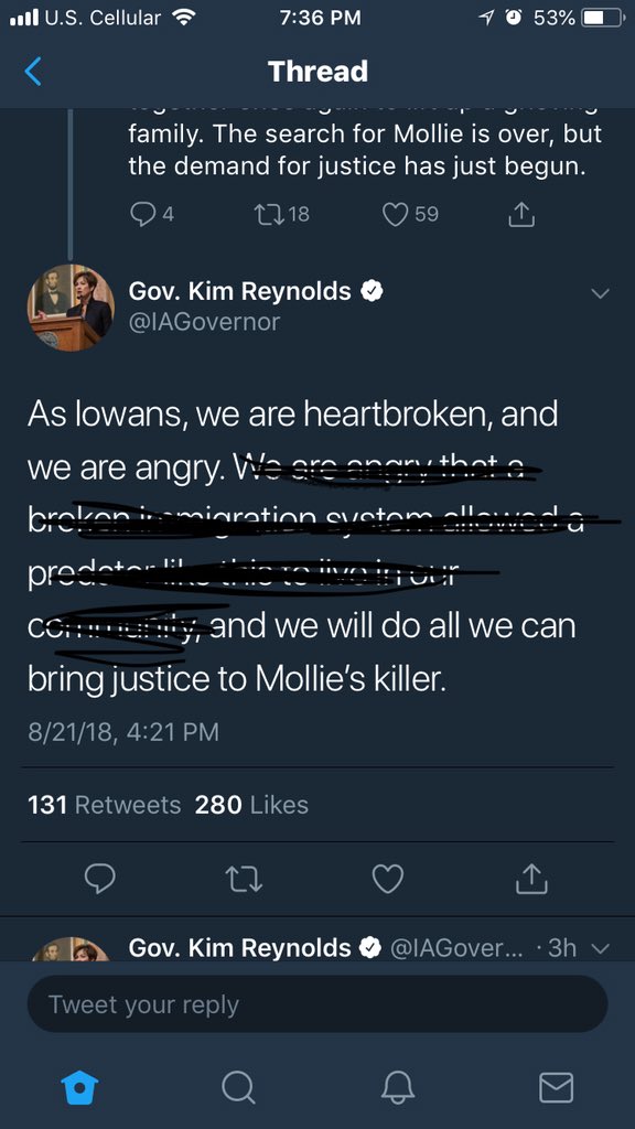 My statement on Mollie Tibbetts: Today, our state woke up to heart-wrenching news. As a mother, I can’t imagine the sorrow felt by the Tibbetts family. We are all suffering over the death of Mollie, knowing that it could have been our own daughter, sister or friend.