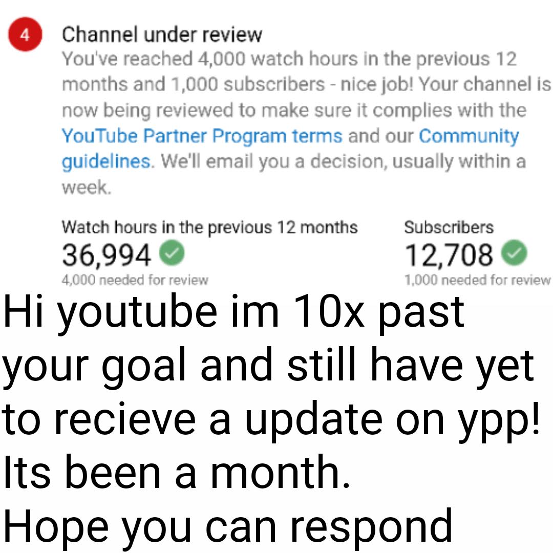 Hi @YTCreators @teamYouTube im 11X past the youtube partner programs requirements and its been a month since my application was submitted. When will the next #YPP update be? ( someone help me ) #youtube #youtuber #youtubehelp #help #ypp #youtubepartnerprogram pleasepic.twitter.com/25PbyWPC5T