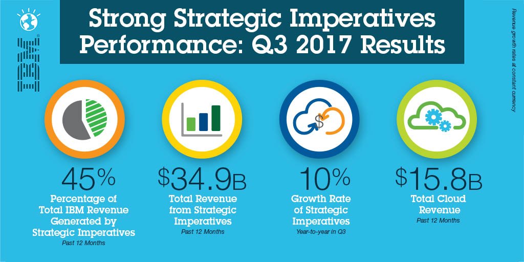 In 3Q 2017, $IBM strategic imperatives revenue increased 11%, w/ strong double-digit growth in #cloud, #security http://bit.ly/2kWucQj pic.twitter.com/Lbrhz8lbZE