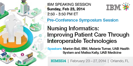 Join IBM's Marion Ball's talk on 'Improving Patient Care Through Interoperable Technologies' tomorrow at #HIMSS14pic.twitter.com/eMEuUeIBiN