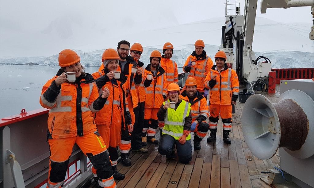 Sediment Sampling in Börgen Bay yesterday. Great effort from the crew of RRS James Clark Ross to hand haul sediments up 200m from the seabed!