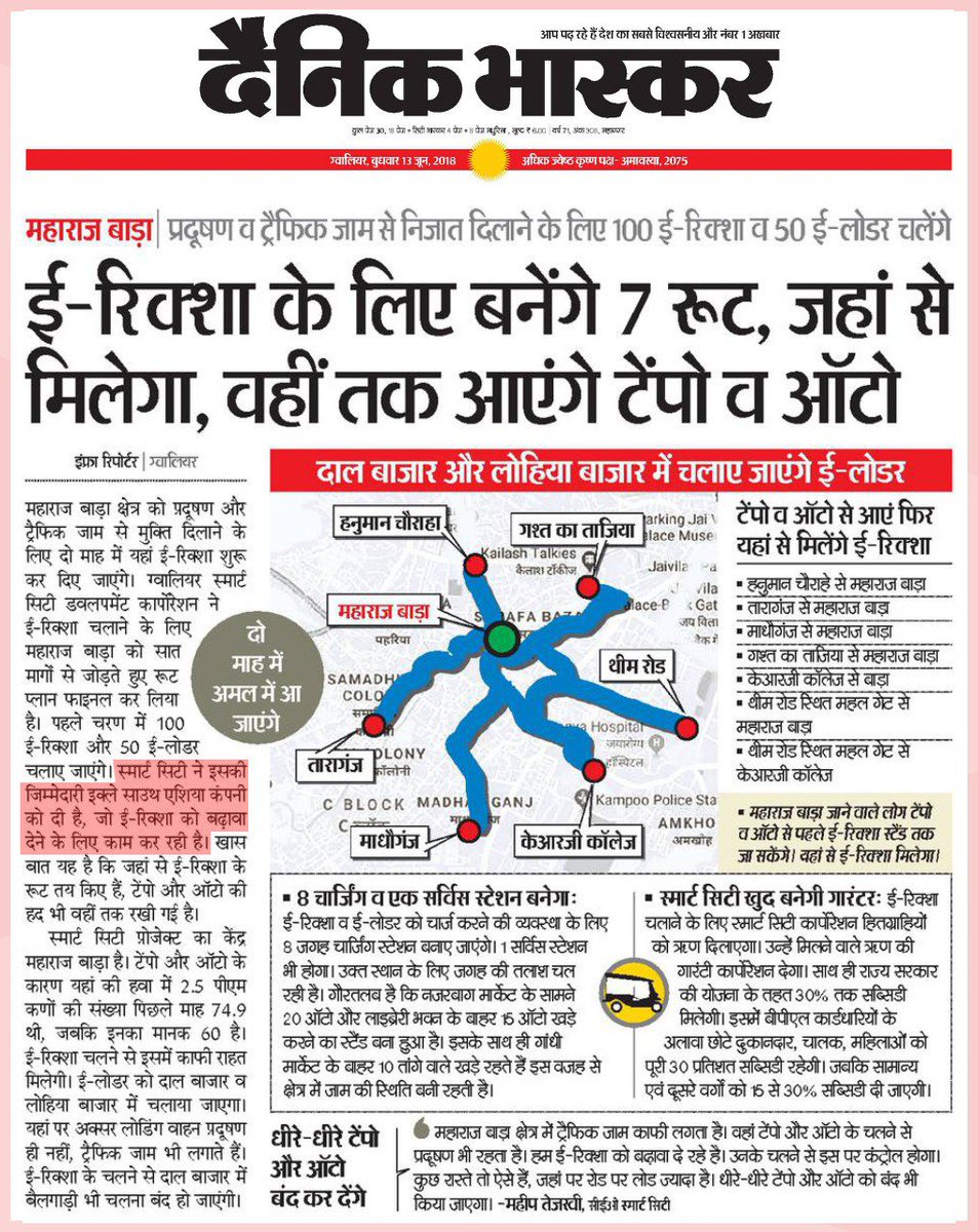 We got a mention in the @Dainik_Bhaskar_ #news #report for assisting #Gwalior in the promotion of #erickshaws to phase out #polluting #tempos from its #heritage #center i.e. Maharaja Bada. This initiative is part of the @SmartCities_HUA.pic.twitter.com/RTNIWlPNMe