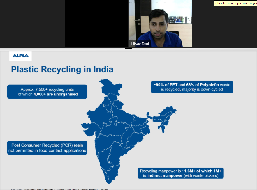 Utsav Dixit, Alpenplastik Lehner Alwin GmbH & Co KG (ALPLA), India talks about plastic recycling and its supply chain in India - opportunities and challenges. #plasticpollutionpic.twitter.com/5VSFf9HOB6