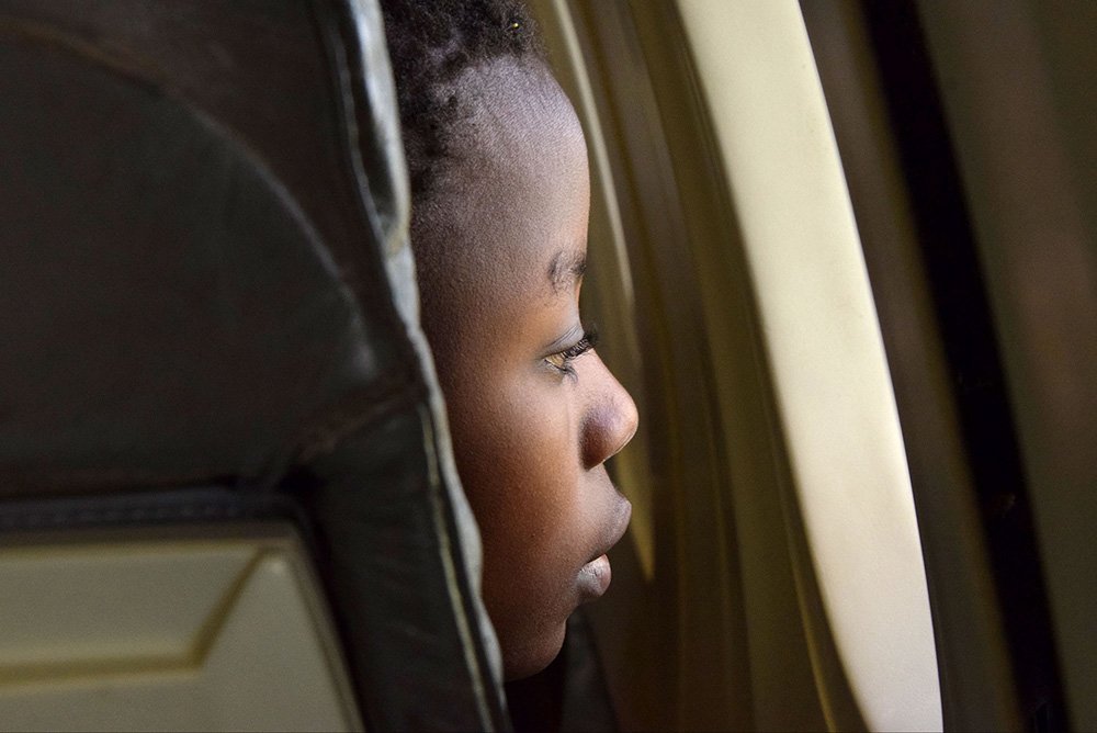 A young girl is helped with her seatbelt on an ICRC flight home. She was separated from her family in the