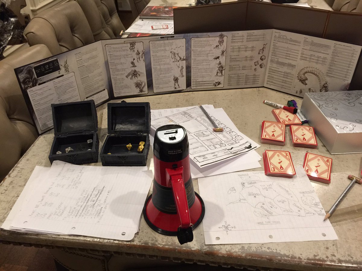 My son’s D&D DM gear — dice, screen, notes, and... bullhorn for talking over a table of noisy teenagers.pic.twitter.com/7HyZfXm2nF