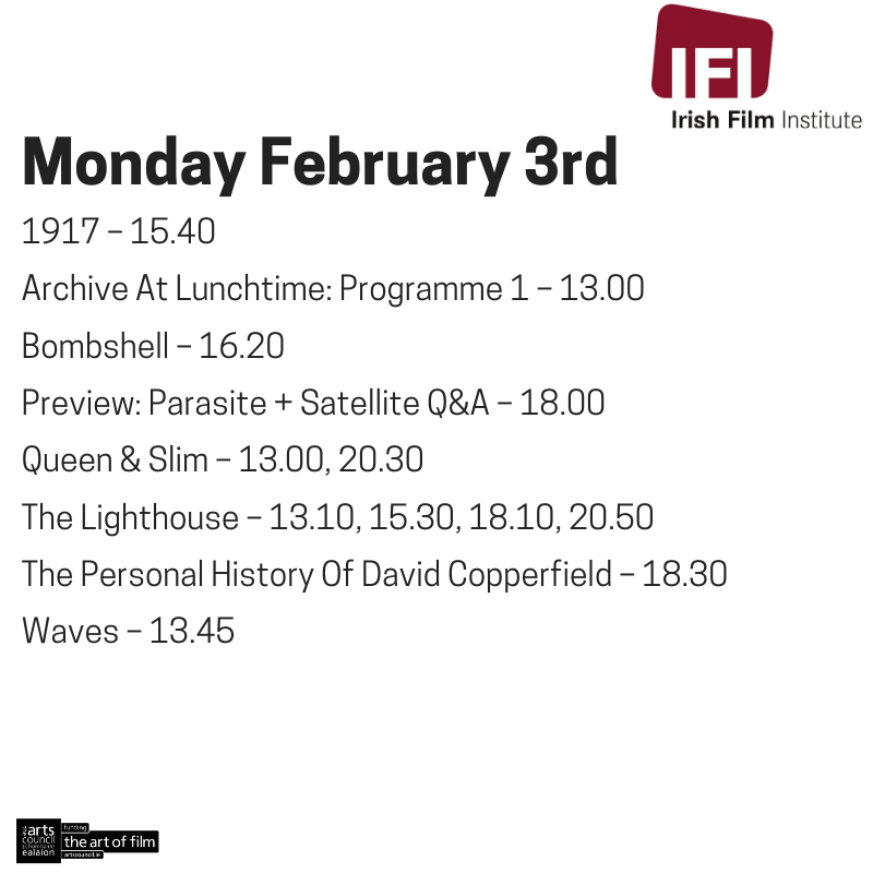 Still to come this evening: The Lighthouse, Queen & Slim, The Personal History of David Copperfield and our sold out preview of Parasite + Q&A with director Bong Joon Ho. https://ifi.ie/weekly-schedule pic.twitter.com/ng2ICinlq6