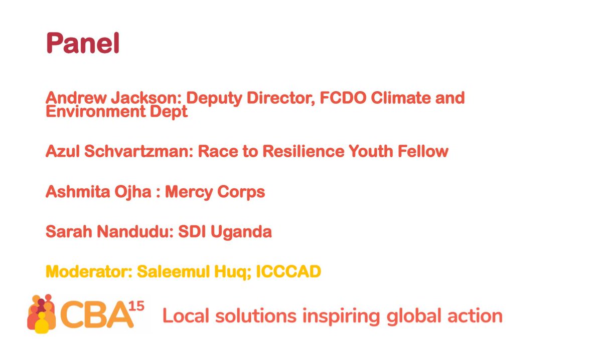 Thank you so much to #CBA15 funders @CJRFund & @Irish_Aid; co-hosts @grp_resilience @PracticalAction & @ICCCAD; contributing partners @gayoghana @BRACworld @HuairouConnect @IUCNNL @actade @giz_gmbh @VSO_Intl; & sponsor EnGen.pic.twitter.com/IuqvMxKmRW