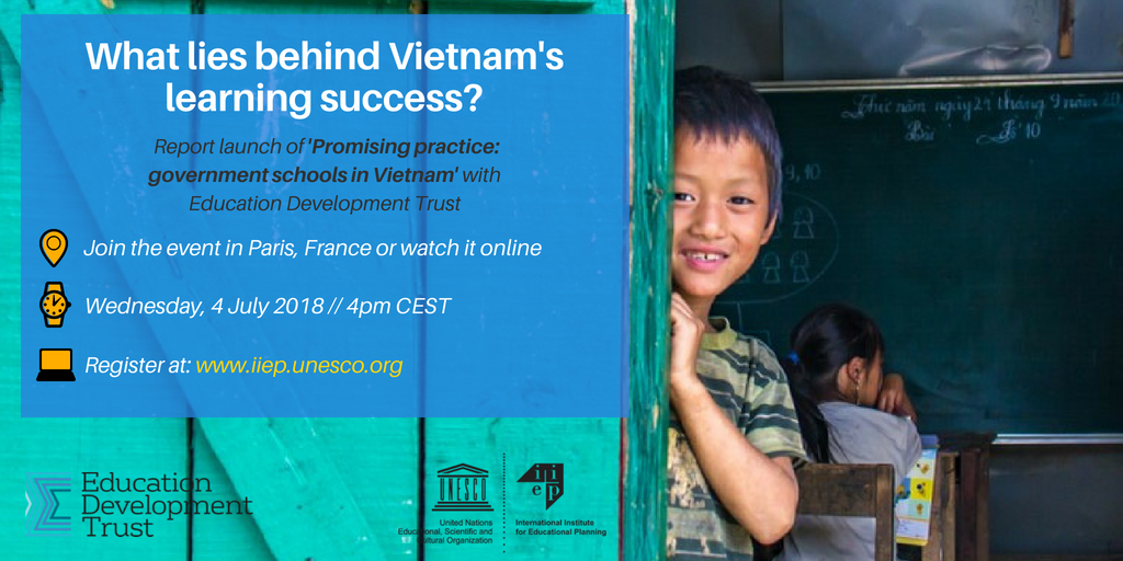 What lies behind #Vietnam’s learning success? Join @EdDevTrust at IIEP for the launch of their new report Promising practice: government schools in Vietnam -> RSVP here (in Paris & online): https://buff.ly/2JZr26v pic.twitter.com/OzyaxsVyO0