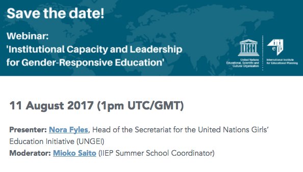 #Savethedate Join our next webinar with @NoraFyles @UNGEI - Register here: https://www.eventbrite.com/e/webinar-institutional-capacity-and-leadership-for-gender-responsive-education-tickets-36834201087 …pic.twitter.com/ciSf8Saw9u