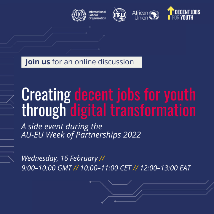 Happening TODAY: join high-level speakers from @ILO,@ITU,@_AfricanUnion,@giz_gmbh & youth reps to discuss scaling up action to harness Africa's#DigitalTransformation to create#DecentJobs for youth