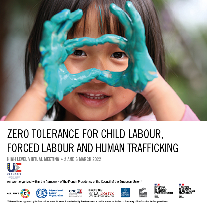 Participate in the @Alliance8_7 meeting "Zero Tolerance for#ChildLabour,#ForcedLabour and Human Trafficking". An event organized within the framework of the French Presidency of the EU Council.