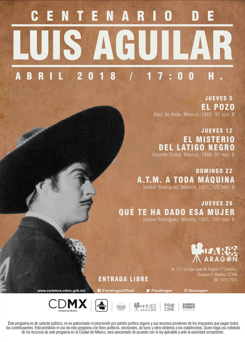 #100AñosDeLuisAguilar se realizará durante el mes de abril en@FaroAragon,#CDMX. Consulta cartelera http://www.imcine.gob.mx/comunicacion-social/comunicados-y-noticias/ciclo-de-cine-100-anos-de-luis-aguilar-llega-a-la-cdmx …pic.twitter.com/ZFrNE1iNC0