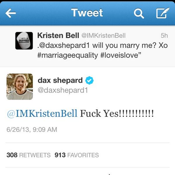 #DOMA ruling RT@IMKristenBell: .@daxshepard1 will you marry me? Xo#marriageequality#loveislove
