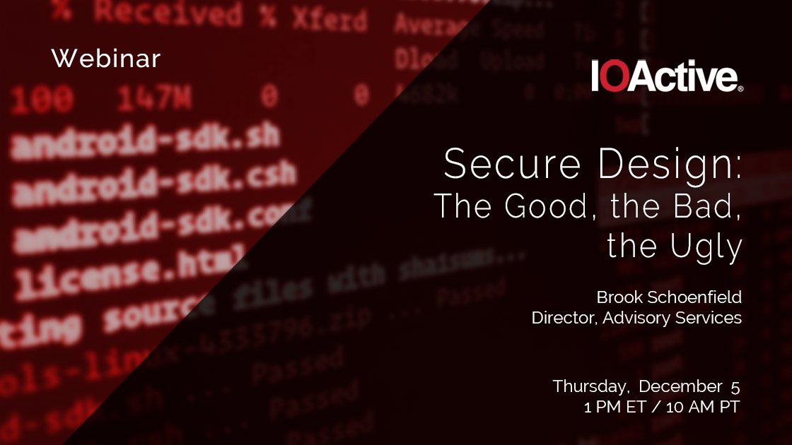Interested in Secure Design? Join Brook Schoenfield, Director of Advisory Services for IOActive, as he will bring together previous learnings and place secure design into its larger, software security and development context. https://ioac.tv/2ROwGNL pic.twitter.com/b7jTLApeI3