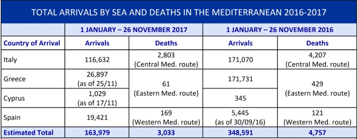 At least 3,000 migrant or refugee deaths on Mediterranean Sea routes through 26 November 2017, marking the fourth consecutive year that IOM’s Missing Migrants Project (MMP) has reported this total https://www.iom.int/news/migrant-drownings-top-3000-4th-straight-year-despite-reduced-migrant-crossings-mediterranean …pic.twitter.com/VheOLXaWgc