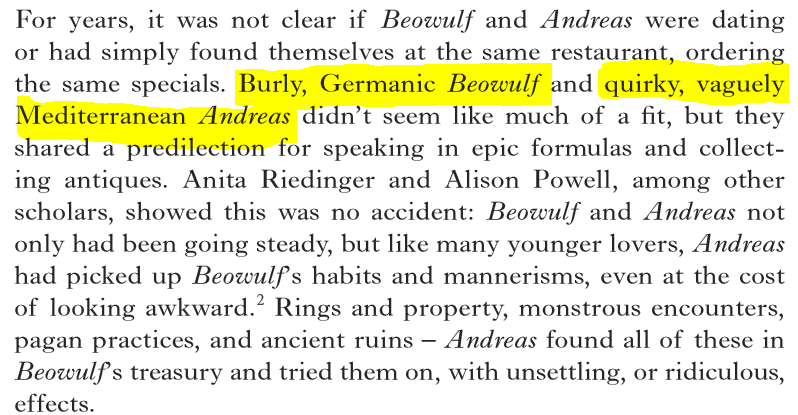 Another essay racializes Beowulf & Andreas (two characters in Old English poems) in some wtf way. The inflammatory language throughout about darkness & savages of the “mediterranean looking Andreas” reeks of racist language --- something that neither the author nor the editors 16pic.twitter.com/X4RTtrjGi9