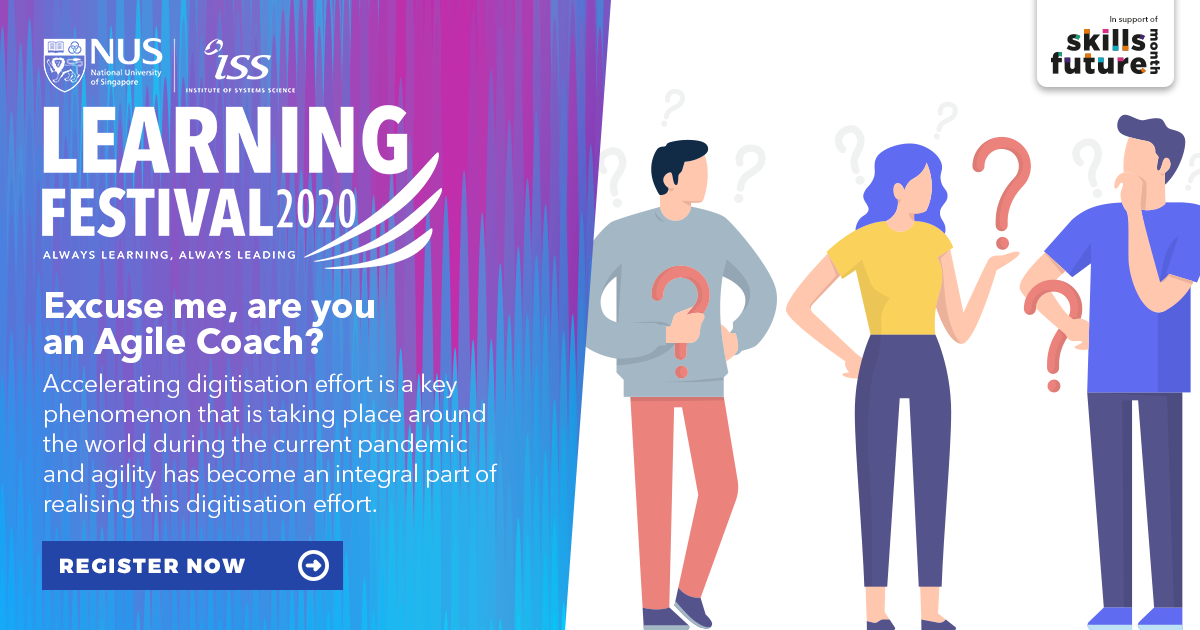 Accelerating digitisation effort is a key phenomenon that is taking place around the world during the pandemic and agility has become an integral part of realising this. Join us for 'Excuse me, are you an Agile Coach?'. Sign up now: https://www.iss.nus.edu.sg/learning-festival …pic.twitter.com/fnj2RA4TPW
