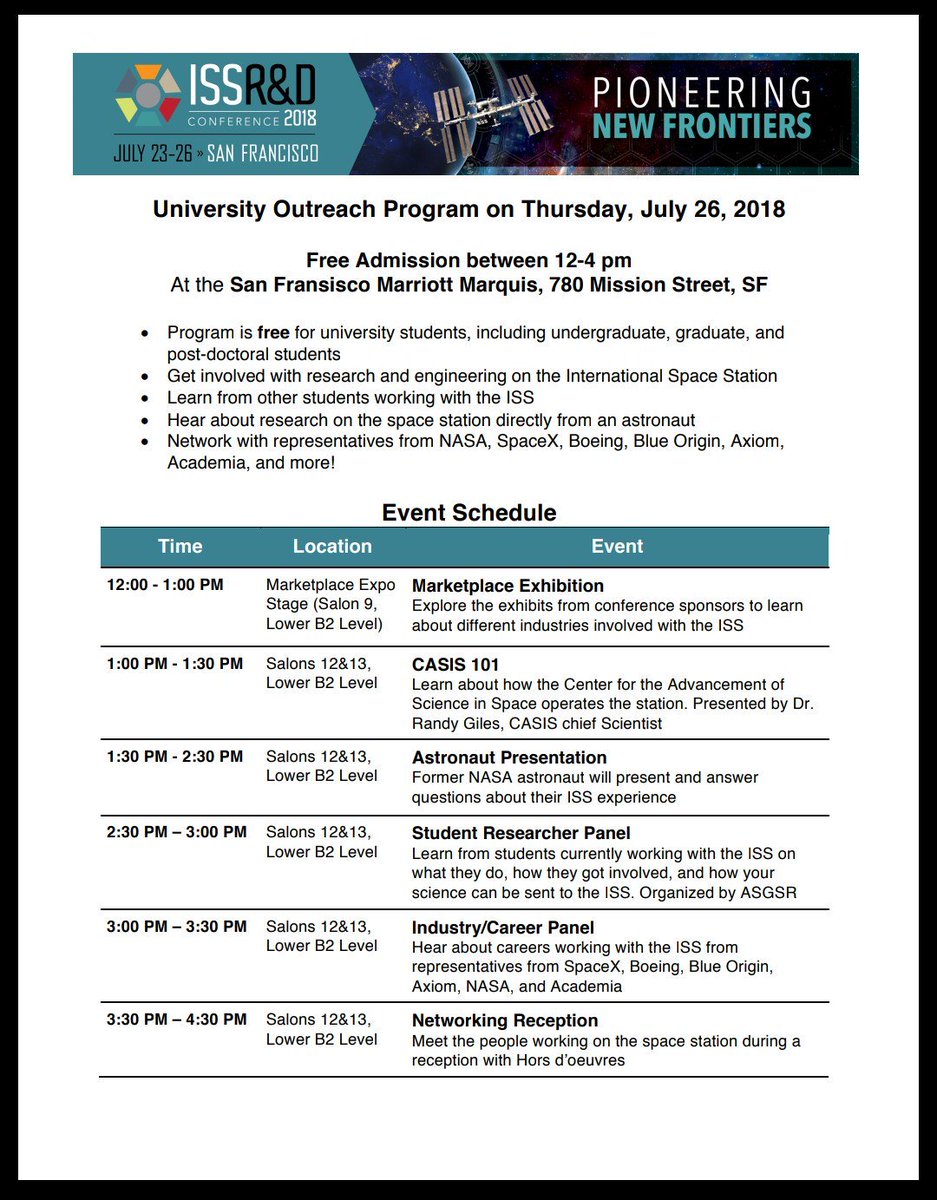 Are you a student around the Bay Area on July 26th interested in space research? You can attend FOR FREE to the University Outreach Day at the ISSR&D conference in San Francisco! All you should do is to sign up in this event via eventbrite or by email! See you there!