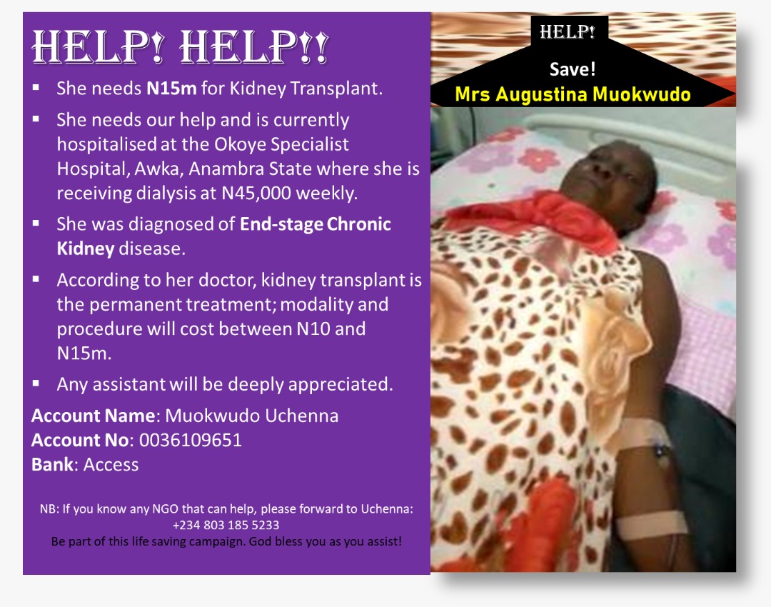 *Save! Mrs Augustina Muokwudo* *She needs N15m for Kidney Transplant. *Hospitalised