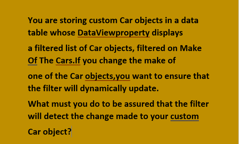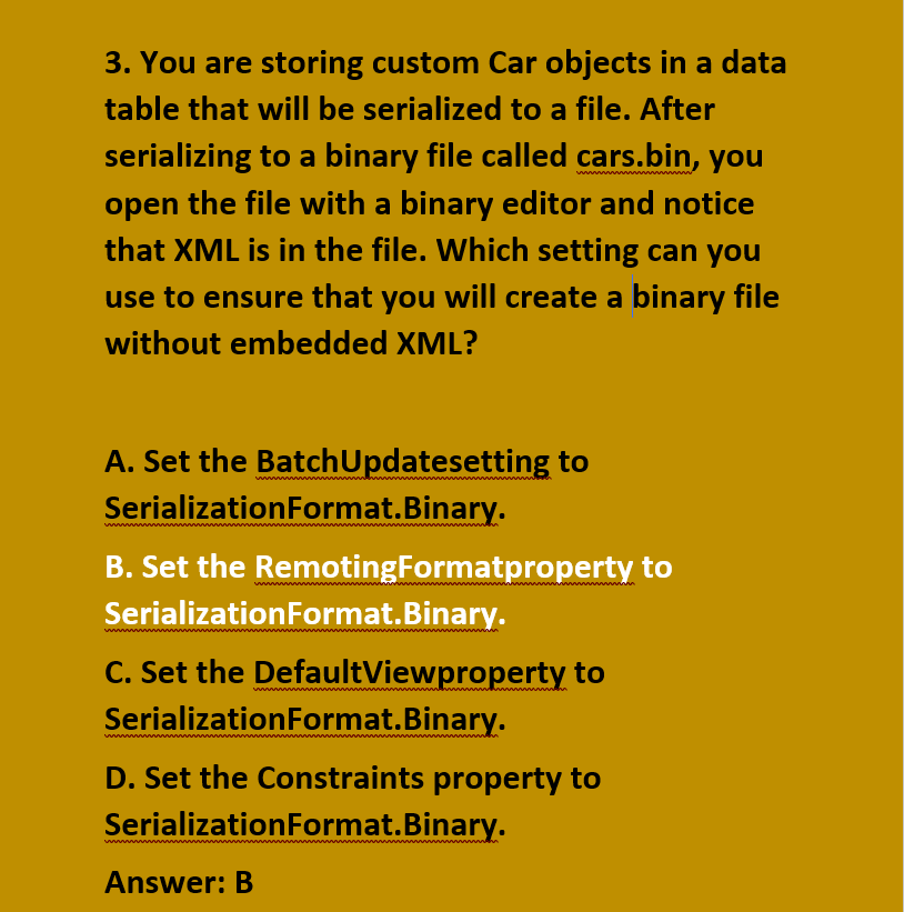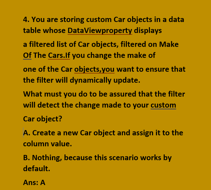 Option and Answer of previous question tweet : A. Create a new Car object and assign it to the column value. B. Nothing, because this scenario works by default. Ans: A For learn more about http://ADO.NET Visit http://snip.ly/ics8b9