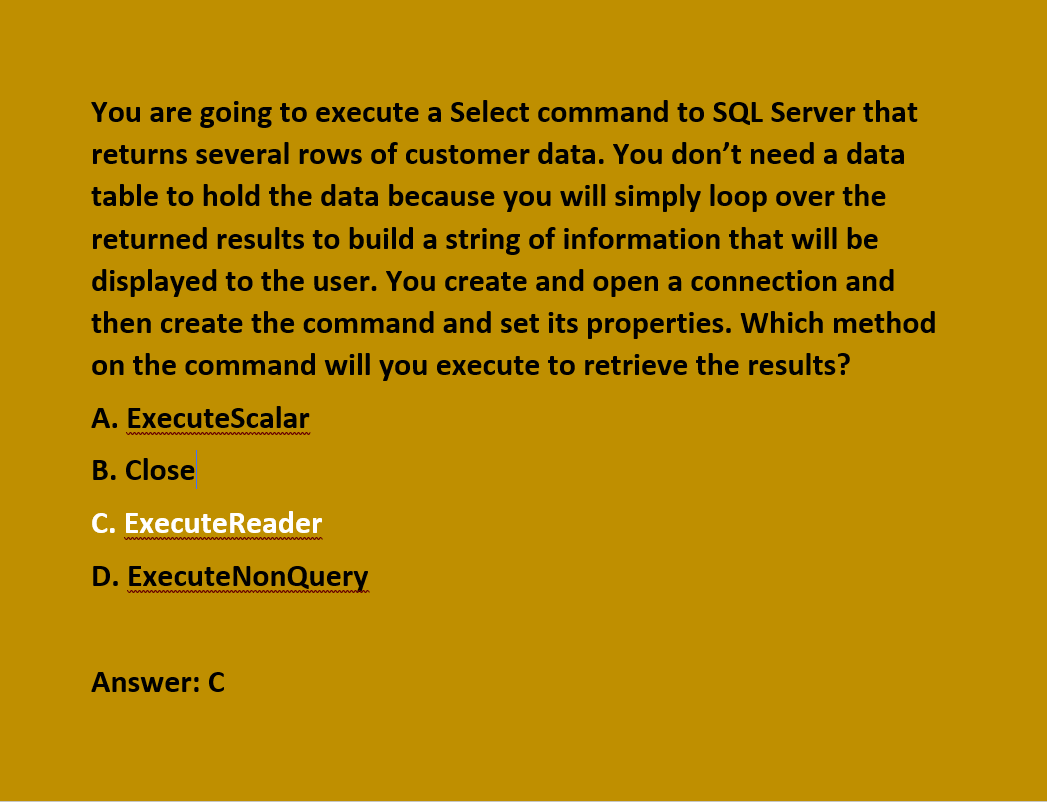 You want to execute a SQL insert statement from your client application, so you set theCommandTextproperty of the command object and open the connection. Which method will you execute on the command? A. ExecuteScalar B. ExecuteXmlReader C. ExecuteReader D. ExecuteNonQuery Ans: D