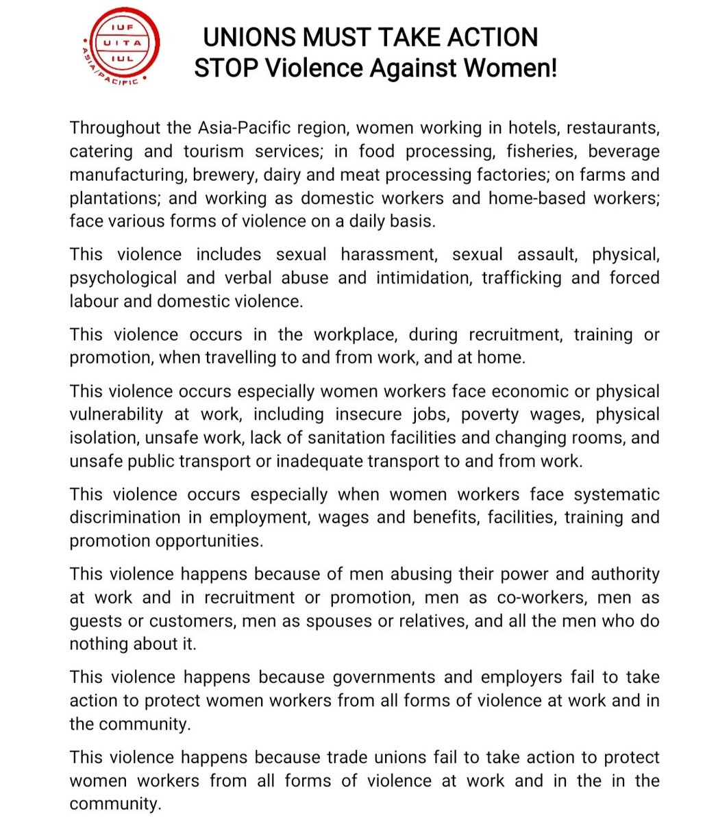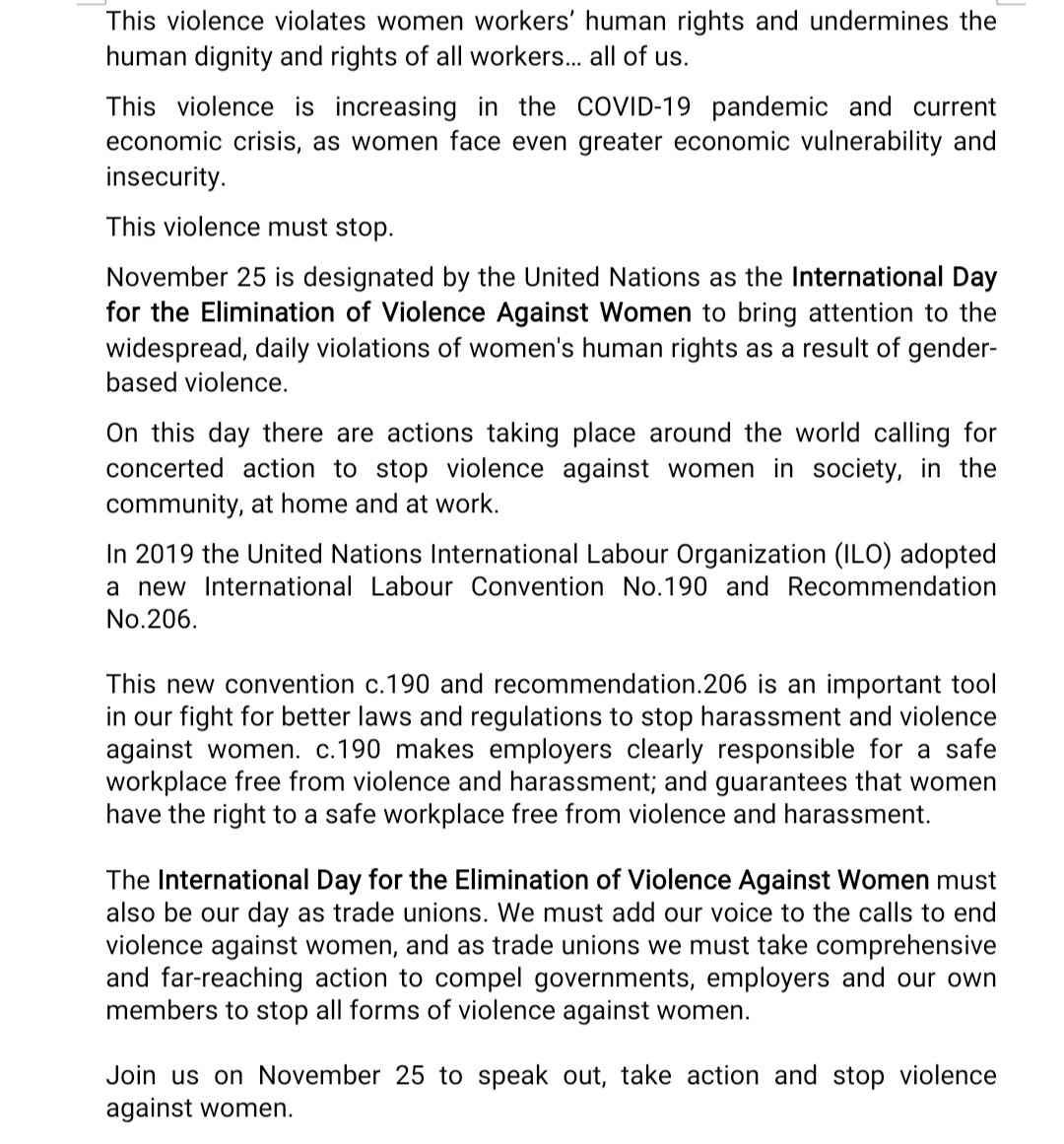 International Day for Elimination of Violence Against Women must also be our day as trade unions. As trade unions we must take comprehensive & far-reaching action to compel governments, employers & our own members to stop all forms of violence against womenpic.twitter.com/8EXGBn8YU1