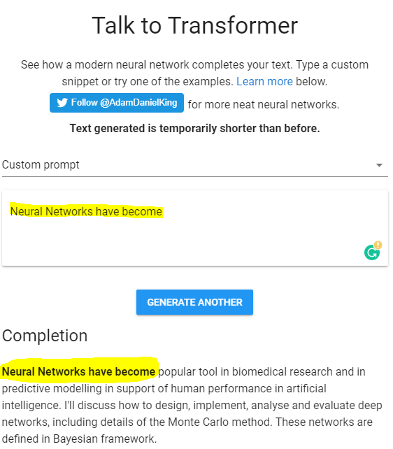 #Transformer Network completes the text. https://talktotransformer.com#AI#NLP#NeuralNetworkspic.twitter.com/JA8c0M9H7f