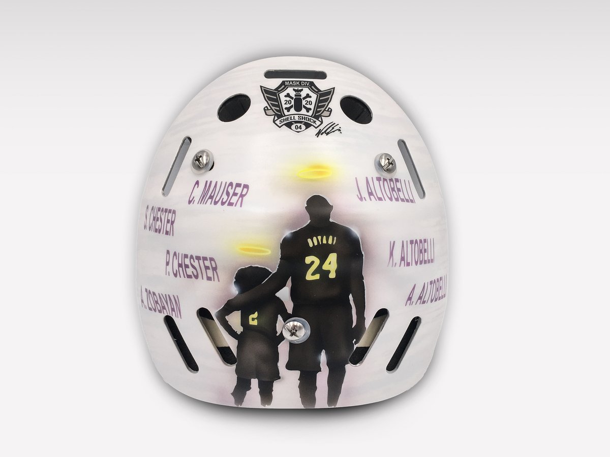 #NHLDucks take on the Lightning at@HondaCenter. The mask features a silhouette of Kobe and his daughter, Gianna, surrounded by the names of the seven other victims of the tragedy.