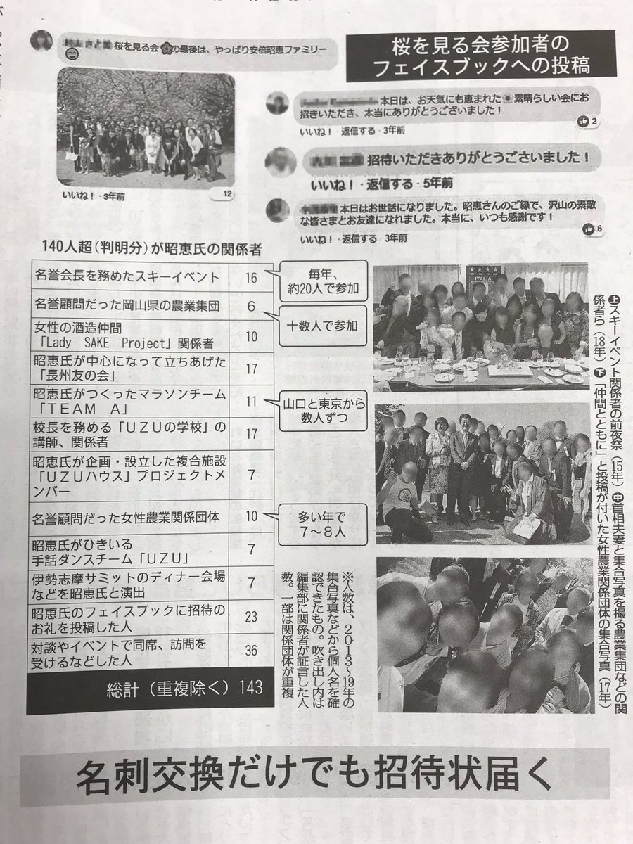 安倍晋三首相主催「桜を見る会」の私物化疑惑追及第5弾。首相の招待枠に含まれる昭恵氏枠の人脈を参加者への取材やSNSから独自集計。確認できただけで2013年以降、140人超が参加していました。証言で、スキー、マラソン友だちなどが集団参加し恒例行事化していた実態も判明。疑惑は底なしですpic.twitter.com/PUeDEwiGOp