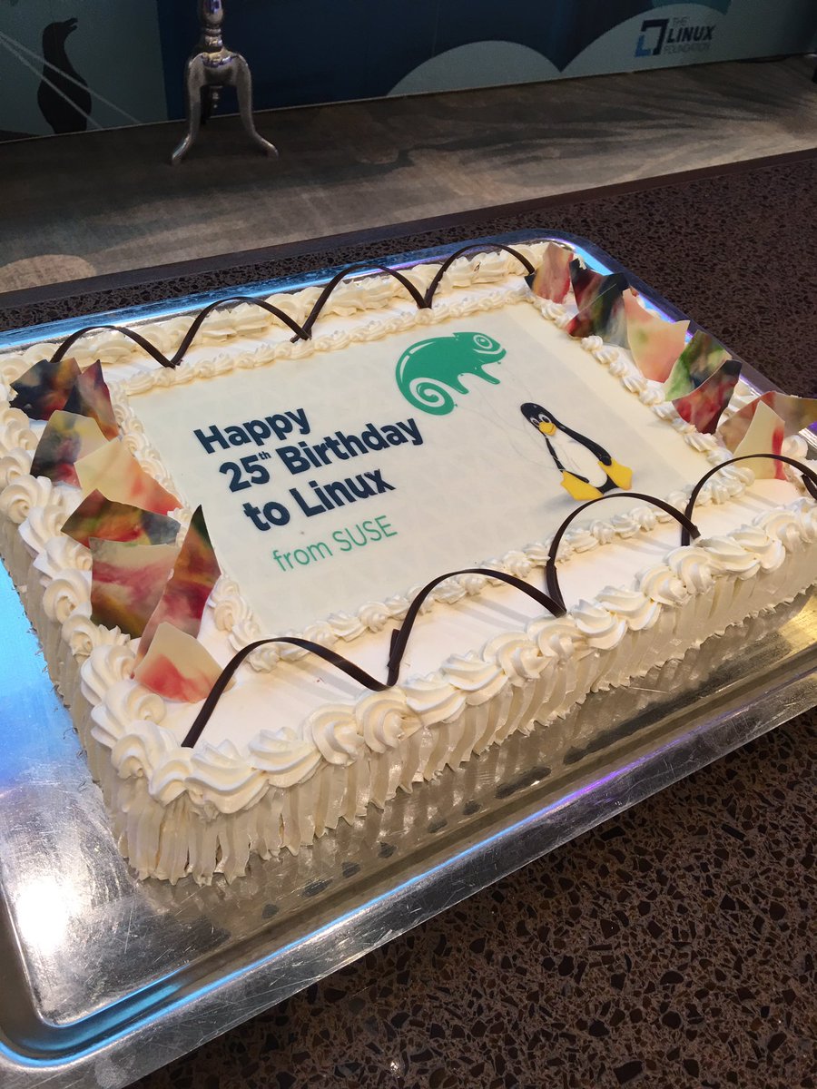 We're still a few days away from Linux's 25th birthday, but that doesn't mean we can't have cake! #LinuxCon pic.twitter.com/KHYGqaG2mu