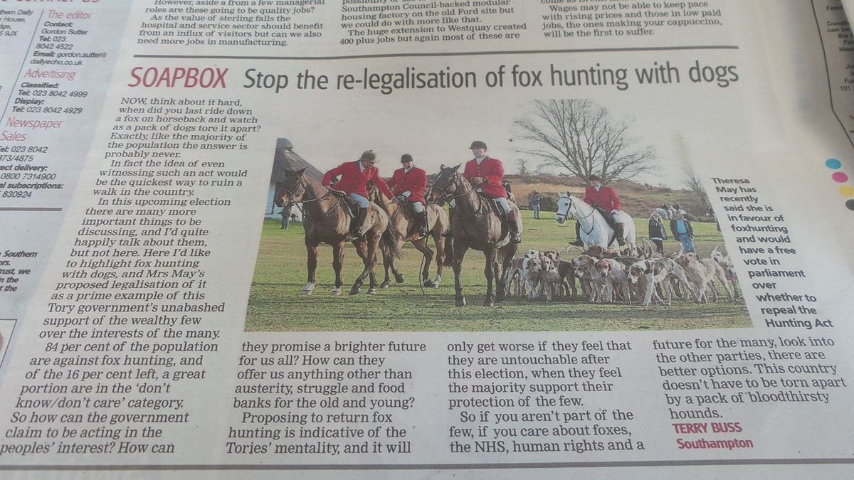 @dailyecho from a local Green Party member on fox-hunting@carolinenokes a big supporter of#foxhunting#votegreen2017pic.twitter.com/TiVXoCDO6Q