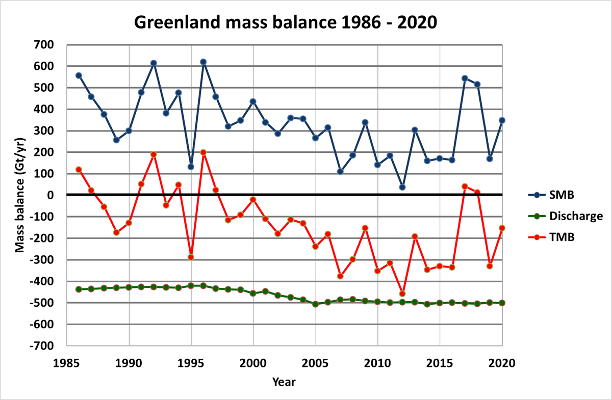 34 years Greenland Ice Sheet mass balance. Blue: Surface mass balance (snowfall-runoff), green: discharge due to iceberg calving, red: total mass balance, the sum of the two. Estimate from observations and model data.