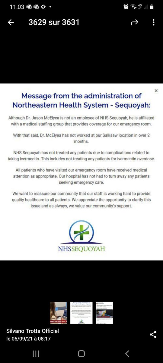 Alors ta capture, c'est un hôpital d'Oklahoma qui a remis en cause un témoignage. Rolling Stone en parle. https://www.rollingstone.com/politics/politics-news/gunshot-victims-horse-dewormer-ivermectin-oklahoma-hospitals-covid-1220608/ … Dans ma chronique je parle des 70% de gens qui ont appelé le centre anti poison à cause de l'ivermectin au Mississippi. https://msdh.ms.gov/msdhsite/_static/resources/15400.pdf …