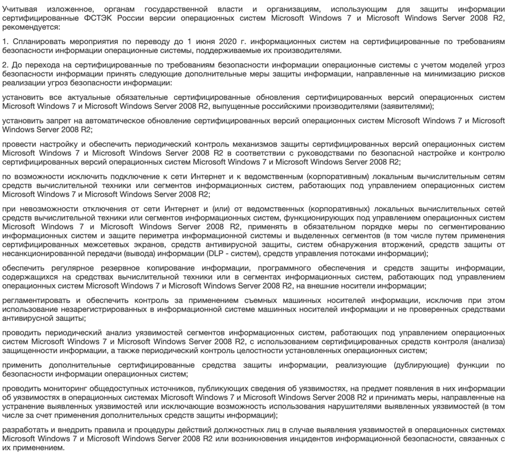ФСТЭК: прекращено действие сертификатов на Microsoft Windows 7 и Server 2008 R2, пользователям данных сертифицированных версий рекомендуется до 1 июня 2020 перейти на другие поддерживаемые операционные системы, а до перехода принять дополнительные меры. https://fstec.ru/normotvorcheskaya/informatsionnye-i-analiticheskie-materialy/2016-informatsionnoe-soobshchenie-fstek-rossii-ot-20-yanvarya-2020-g-n-240-24-250 …pic.twitter.com/lOMqpi3OmQ