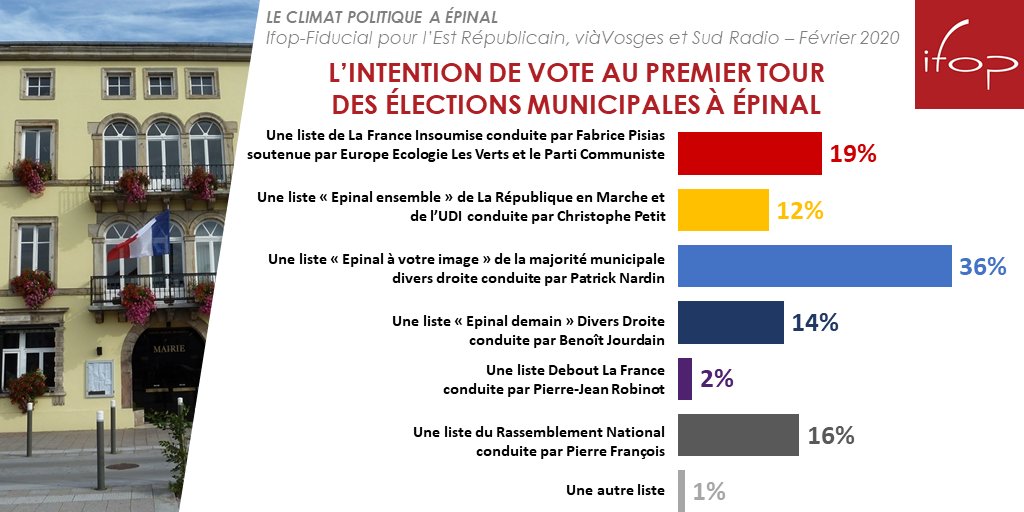 #Municipales2020 à#Épinal : - Majorité#DVD 36% -#LFI#EELV#PCF 19% -#RN 16% -#DVD 14% -#LREM#UDI 12% Sondage@IfopOpinion@Fiducial@lestrepublicain@viaVosges@SudRadio