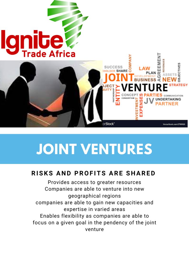 Joint ventures also enable the business to access new markets and distribution networks and sharing of risks and costs. Ignite Trade Africa specializes in consulting such as advising companies on the best form of market entry strategies to adopt when venturing into a new market.pic.twitter.com/dSltnfDBRZ