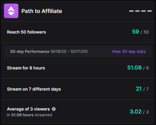 2 months and 12 days since my first stream and I've met all 4 requirements for Twitch Affiliate. Appreciate everyone that has followed the stream and come by to watch. Time to invest and upgrade the stream. Looking forward to the next phase! #RoadToAffiliate #twitchaffiliatepic.twitter.com/GbkhQCk9Mn