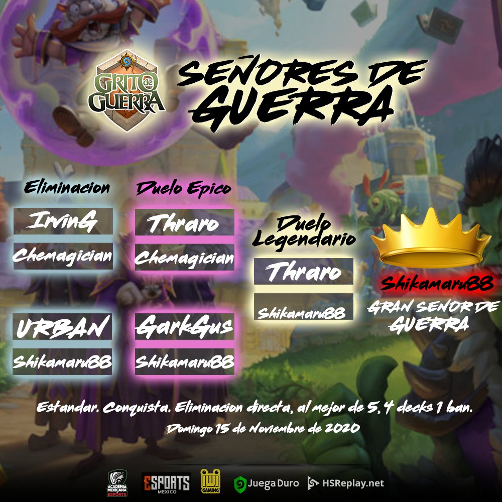 RESULTADOS GRITO DE GUERRA #GranSeñorDeGuerra 🏆 🇫🇷 @ShikamaruHS se impone en la final ante 🏅 🇦🇷 @ThraroH . Mención honorífica a los mexicanos 🇲🇽 @IrvinGSlz , @Chemagician , @Garkgus y @NetoUrban26 que lograron clasificarse a la etapa final de Señores de Guerra. pic.twitter.com/sV8sUEv3sg