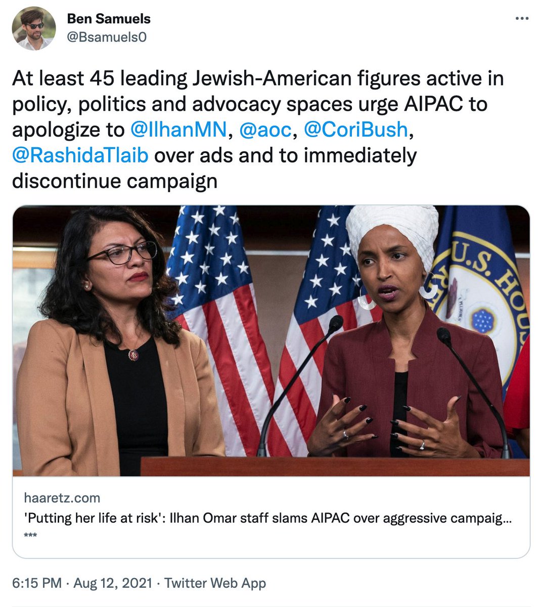 @AIPAC ads targeting@IlhanMN with Islamophobic hate, saying she thinks "there is no difference between America and the Taliban" (a blatant lie). Dozens of Jewish groups demanded they take them down last year. They refused.pic.twitter.com/LUTRj4K3e6