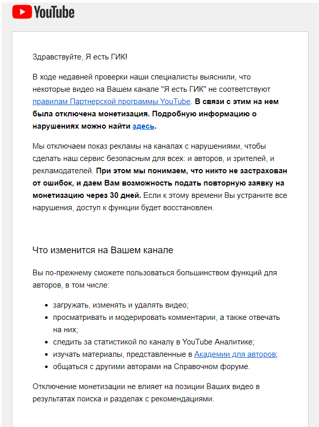 Могли бы вы, пожалуйста, предоставить скриншот письма, которое должно было прийти на вашу электронную почту насчет отключения монетизации?