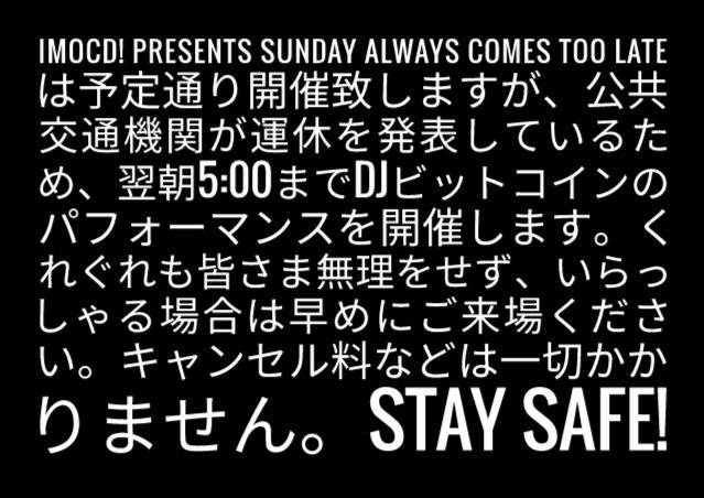 IMOCD! presents Sunday Always Comes Too Lateは予定通り開催致しますが、公共交通機関が運休を発表しているため、翌朝5:00までDJビットコインのパフォーマンスを開催します。くれぐれも皆さま無理をせず、いらっしゃる場合は早めにご来場ください。キャンセル料などは一切かかりません。Stay Safe!pic.twitter.com/8ZwG7qcZph