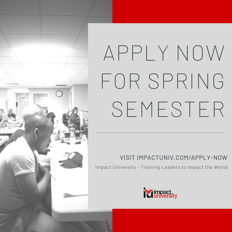 Now is the time to apply for the Spring Semester at Impact University! We offer degrees in Theology, Pastoral Ministry, Counseling, and Worship.